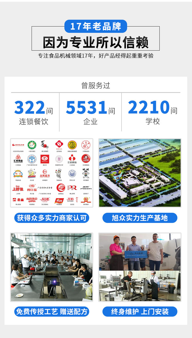 廣州旭眾食品機械有限公司是一家集科研開發(fā),生產(chǎn)設(shè)計,營銷服務(wù)為一體的現(xiàn)代化生產(chǎn)企業(yè)?,F(xiàn)代化生產(chǎn)車間,精湛制造技術(shù),所產(chǎn)機械歷經(jīng)市場重重考驗,不斷贏得海內(nèi)外客戶的贊譽。