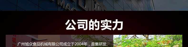 廣州旭眾食品機械有限公司是一家集科研開發(fā),生產(chǎn)設(shè)計,營銷服務(wù)為一體的現(xiàn)代化生產(chǎn)企業(yè)?,F(xiàn)代化生產(chǎn)車間,精湛制造技術(shù),所產(chǎn)機械歷經(jīng)市場重重考驗,不斷贏得海內(nèi)外客戶的贊譽。