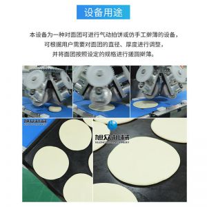 XZ-150型搟薄機,為一種對面團可進行氣動拍餅或仿手工搟薄的設(shè)備,可根據(jù)用戶需要對面團的直徑、厚度進行調(diào)整并將面團按照設(shè)定的規(guī)格進行搓圓摔搟薄。