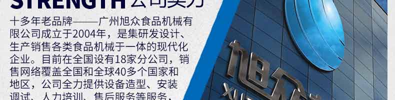 廣州旭眾食品機械有限公司是一家集科研開發(fā),生產(chǎn)設(shè)計,營銷服務(wù)為一體的現(xiàn)代化生產(chǎn)企業(yè)?,F(xiàn)代化生產(chǎn)車間,精湛制造技術(shù),所產(chǎn)機械歷經(jīng)市場重重考驗,不斷贏得海內(nèi)外客戶的贊譽。