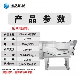 XZ-690A型多功能切菜機(jī),工作效率高,幫你省人工費(fèi)。1小時(shí)可切600kg-1600kg/h,1臺(tái)機(jī)器等于多名廚師同時(shí)為您工作。一機(jī)多用,可切瓜果、蔬菜、藥材,刀片可進(jìn)行更換,設(shè)計(jì)周到,結(jié)構(gòu)合理,簡單輕松應(yīng)對(duì)。