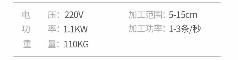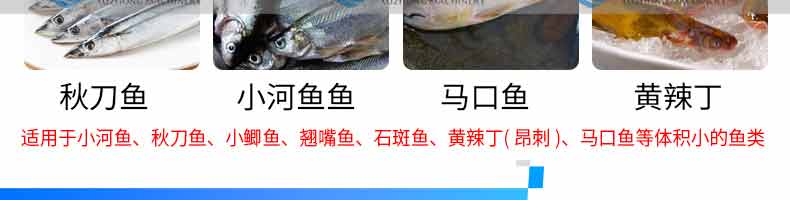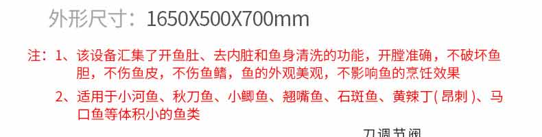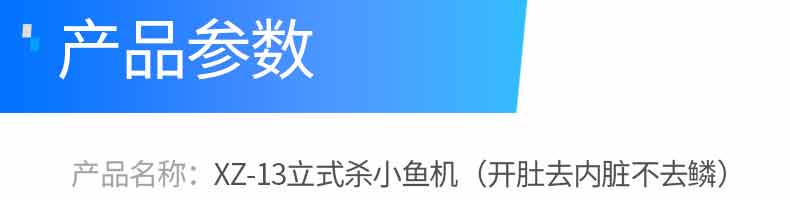 名稱(chēng)XZ-13型立式小殺魚(yú)機(jī)(開(kāi)肚不去鱗) 電源220V 功率1.1kw 產(chǎn)量1-3條/秒 尺寸1650x500x700mm 重量110kg 規(guī)格 其他殺魚(yú)范圍 5-15cm