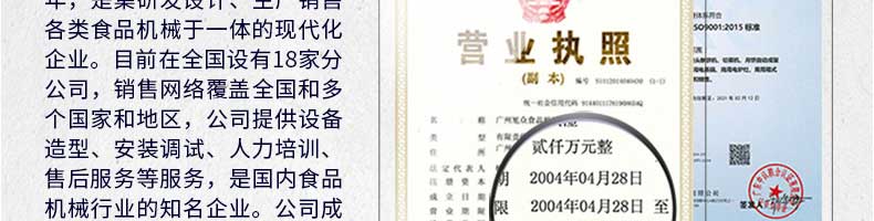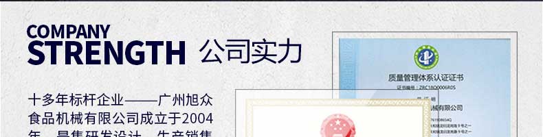 廣州旭眾食品機械有限公司是一家集科研開發(fā),生產(chǎn)設(shè)計,營銷服務(wù)為一體的現(xiàn)代化生產(chǎn)企業(yè)?,F(xiàn)代化生產(chǎn)車間,精湛制造技術(shù),所產(chǎn)機械歷經(jīng)市場重重考驗,不斷贏得海內(nèi)外客戶的贊譽。